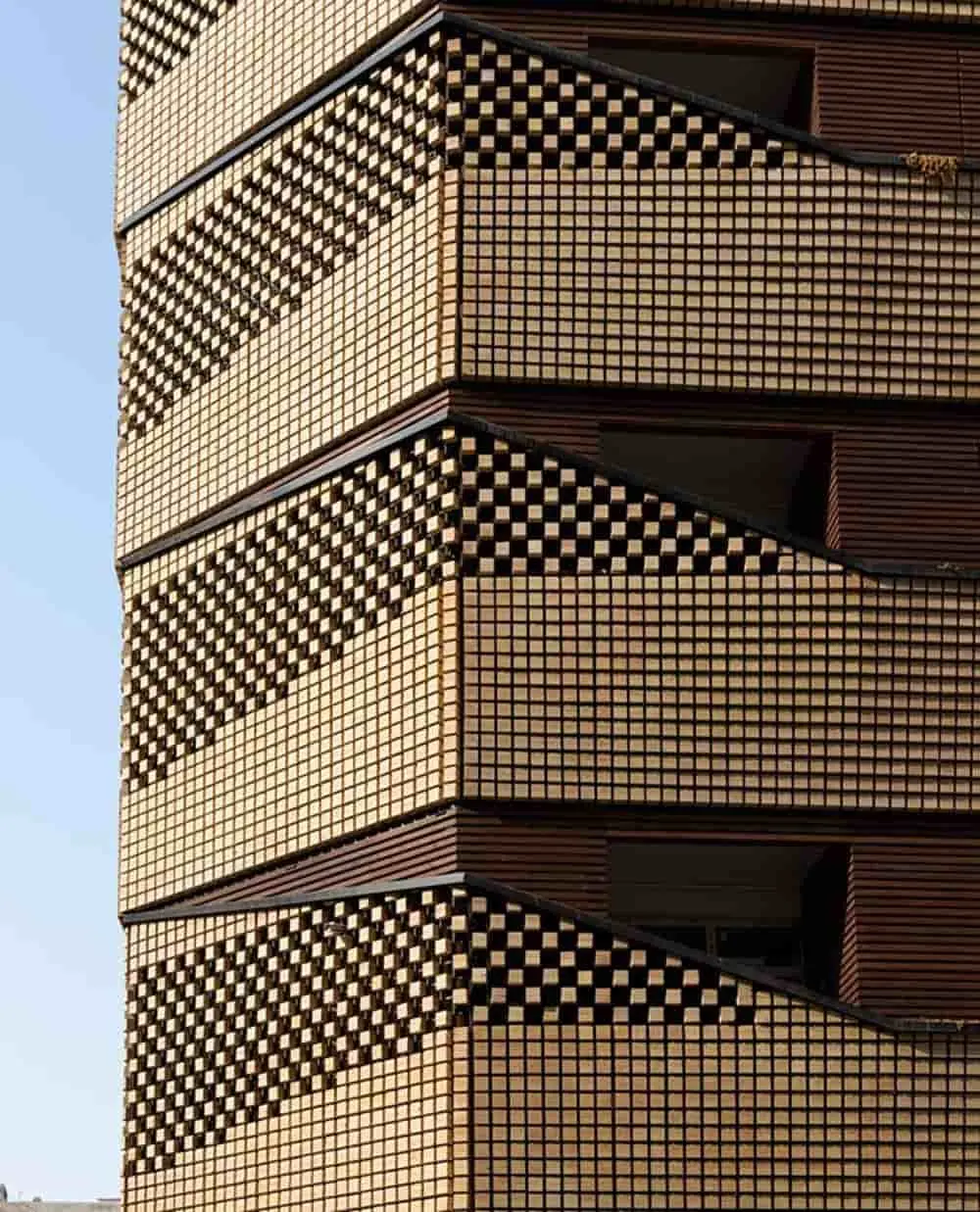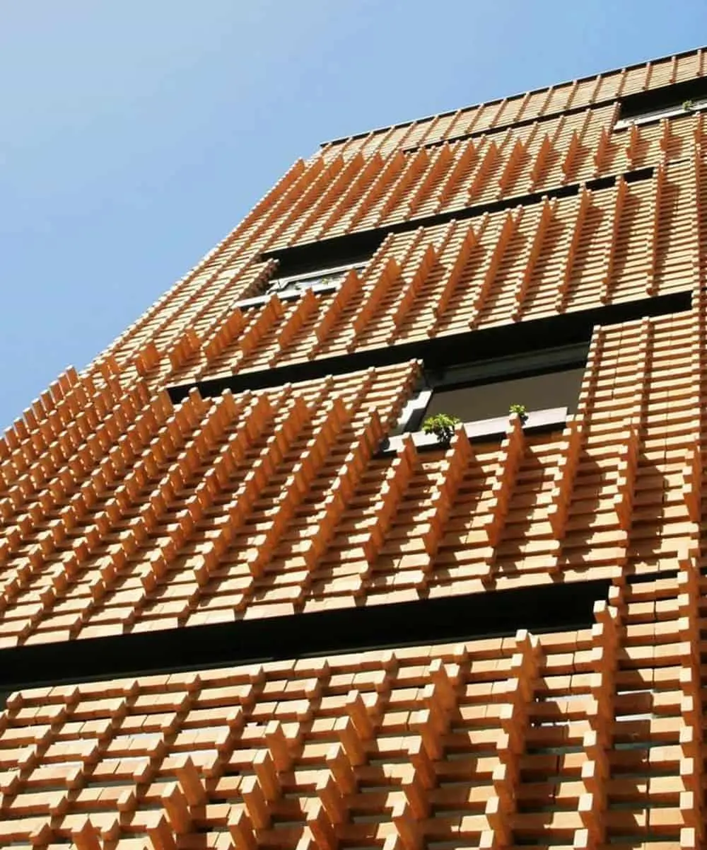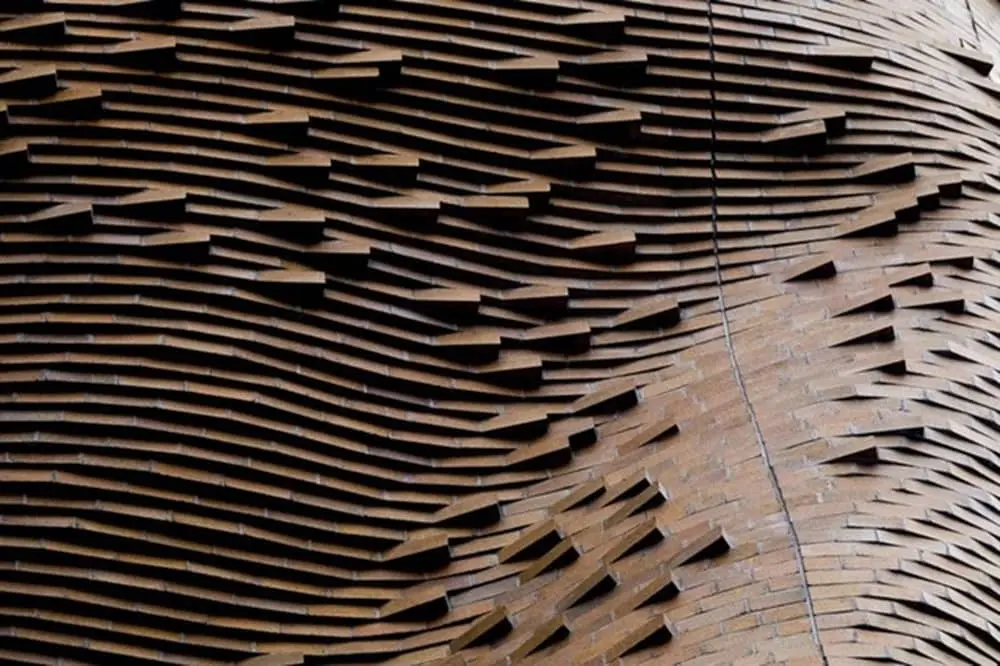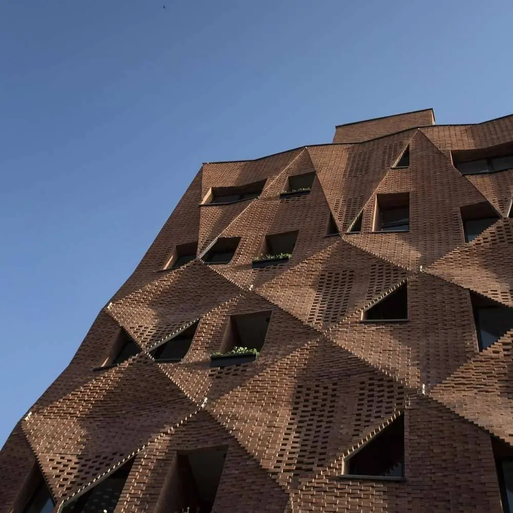 نماهای مدرن آجری: استفاده از الگوهای چیدمان خلاقانه (مانند آجرچینی مشبک یا برجسته) در کنار متریالهایی مانند شیشه و فلز، نماهایی خیرهکننده و مدرن ایجاد میکند.