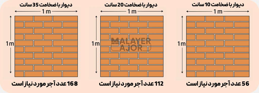 - در دیوارهای قطورتر، مانند دیوار ۳۵ سانتیمتری، تعداد آجر لازم به حدود 168 عدد در هر متر مربع میرسد.
